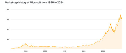 En términos de inversión, Microsoft siempre ha mantenido una posición de liderazgo en el mercado tecnológico gracias a su amplio portafolio de productos y servicios. Es una empresa madura con ingresos diversificados provenientes de sectores como videojuegos, sistemas operativos, buscadores e inteligencia artificial. Además, destaca por repartir dividendos de manera fiel cada cuatro meses, con un crecimiento histórico anualizado del 14%. Cotización histórica de Microsoft | Fuente: companiesmarketcap.com