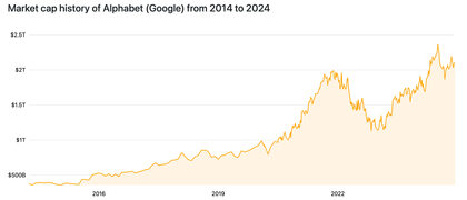 Además, sigue siendo el rey indiscutible de la publicidad online, con más del 80% de la cuota de mercado en motores de búsqueda. Sin embargo, en áreas como el contenido en video, su dominio se ha visto desafiado por el auge de plataformas como TikTok. Cotización histórica de Google | Fuente: companiesmarketcap.com