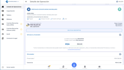 - Inversores.io: Ofrece más de 6 fondos en los cuales uno puede invertir y simular. Entre uno y otro vemos que la rentabilidad puede variar ampliamente. Por una simulación de 350 soles, en un fondo puedo ganar 44 soles, en otros 22 soles. Cada uno detalla su tasa de referencia.