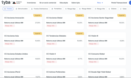 TyBA: tienes fondos, portafolios, niveles y gestión de riesgos y demás. Vemos que tiene una canasta amplia y cada uno ofrece una rentabilidad distinta.